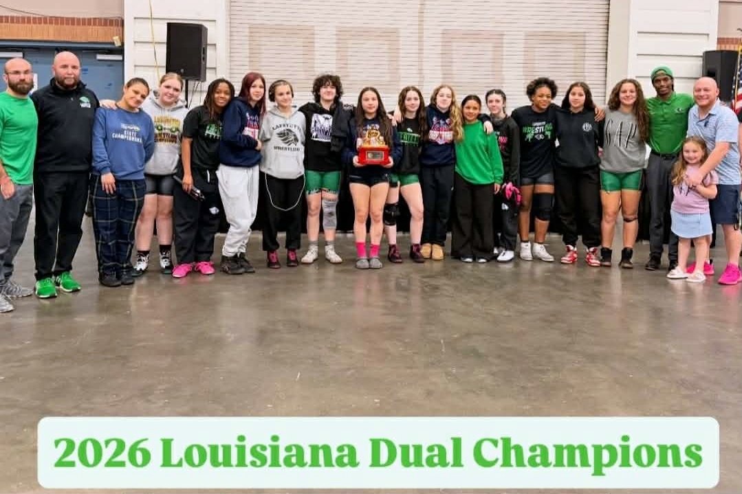 As they have done all season, the Lady Lions of Lafayette dominated their competition to add the 2026 Louisiana Duals Championship to their trophies cabinet (or a closet until a bigger trophy cabinet can be found). Lafayette won their first match 48-23 over Baton Rouge. They followed that with a 54-18 thumping of Zachary. In the finals, they beat the Skippers of Mandeville 59-12. I will list the names of girls who won matches against the Lions rather than naming the Lions who won. This is a much shorter list: Olivia Maxie and Jonnika Pitts of Baton Rouge, Jaiden Dyre and Sophie Page of Zachary, and Gabriella Maldonado of Mandeville.