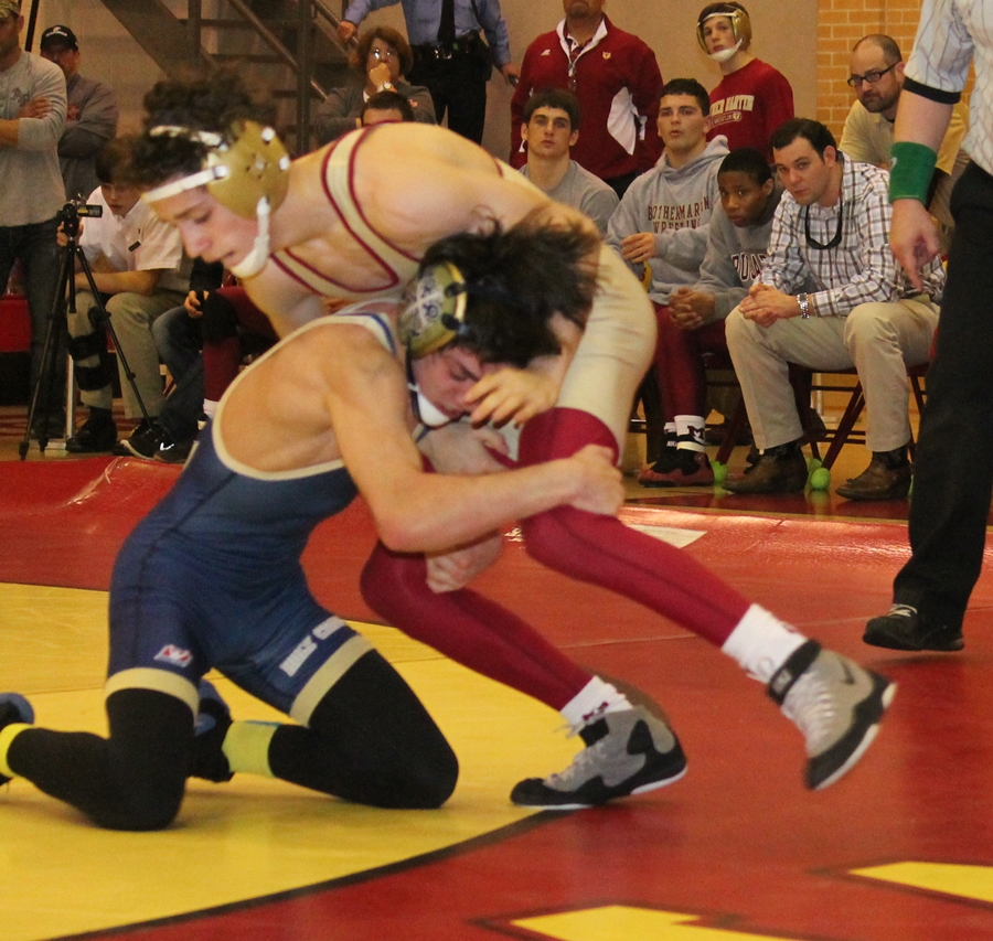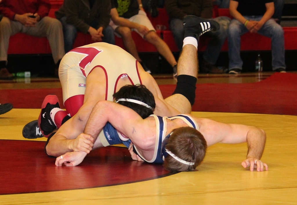 | While Seth Johnson competed for the Crusaders at the Ken Cole it was Ryan Genco filling the 120 spot on this night. His opponent was sophomore Beau Bush, who had compiled a very good 25-7 record which included two previous wins against Genco in which he had not allowed the junior Crusader to score a point. That streak ended when Genco took Bush down early in the match. Bush completed a reversal to tie the score 2-2, which is how the first period ended. On bottom to start the second round Bush scored a quick escape and followed it with a takedown after sprawling on a Genco single-leg shot and spinning behind the Crusader, taking a 5-2 lead. Genco, though, while he was unable to escape from Bush, did not allow himself to be turned over in the remaining 75 seconds of the round. Bush rode Genco well in the third period and it took 1:40 before Genco could get away to make the score 5-3 in Bush's favor. But 20 seconds was not enough for Genco to score another takedown, and Bush's 5-3 score held. | ||||||||||||||||