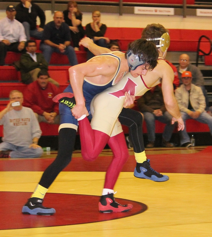 | Even wrestling behind Brother Martin's normal 138 lbs. starter Austin Meyn, junior Blaine Eisensohn has had a good year. His 19-2 record includes a championship at the St. Paul invitational and his only losses have come at the hands of Airline's Antonio Lococo and Rummel's Rick Lacava, both of who will be pretty high seeds in their weight classes come the state tournament. Junior Parker Wilkins has wrestled at 145 lbs. most of the season as Benoit was at 138 lbs., but was given the start against the Crusaders. Eisensohn proved to be too much, however. Before half-a-minute had elapsed Eisensohn had a 4-0 lead after scoring a takedown and two nearfall points. By the end of the first the Crusader had opened up a 6-0 lead. In the second and third rounds Wilkins put an end to Eisensohn's seeming ability to score at will. He gave up a reversal in the second period but did not allow himself to be turned to his back. He allowed an escape in the third period but did not allow Eisensohn to score another takedown. Hence, for two-thirds of the match Wilkins did very well against an opponent with a significantly greater amount of experience. As for Eisensohn, he did his job in scoring a 9-0 win and a major decision for the Crusaders. | ||||||||||||||||