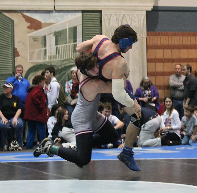 Division I may be a closer championship race than many expected. Brother Martin had only a 5.5 point lead over Jesuit (171.5 to 165) at the end of competition on Friday night. The Crusaders have ten wrestlers in the semifinals while the Blue Jays have nine. In matches at 106, 152 and 160 the two teams face each other. Catholic is not out of the picture as the Bears are in third place with 145.5 points and have six semifinalists, including two defending state champions. Holy Cross, who was expected to at least challenge Jesuit for the runner-up spot at least, and possibly the Crusaders for the championship, suffered a couple of setbacks that will be tough to overcome. Prior to the state tournament junior and the then #3 seed Collin Guerra at 126 lbs. sustained a fractured mandible, and junior Mason Williams suffered a first round tournament-ending injury at 160 lbs. The Tigers are in fourth place but are already 41 points behind Brother Martin and 34.5 points behind Jesuit. Archbishop Rummel is hanging tough in fifth place with 122 points.