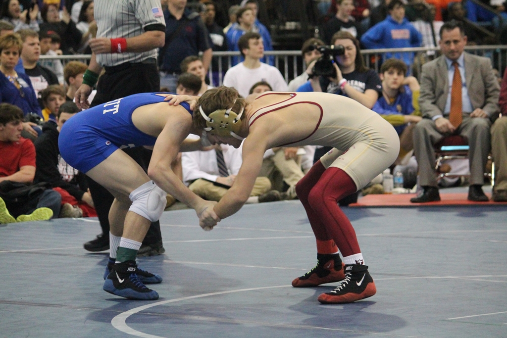 Mason Mauro does not allow opponents to score many points against him. He allowed only 24 points scored against him in the 11 matches in which he did not score a fall. In his two matches against Charles, he held the Blue Jay to one point each time. Neither wrestler could manage a takedown in the first period. In the second Mauro scored an escape after 25 seconds and the he converted a single-leg shot into two takedown points as time was running out to take a 3-0 lead. Charles scored his one escape point quickly, in 10 seconds, but he could not break through Mauro's defense during the remaining 1:50, and Mauro had his second consecutive Division I state title by virtue of a 3-1 score.