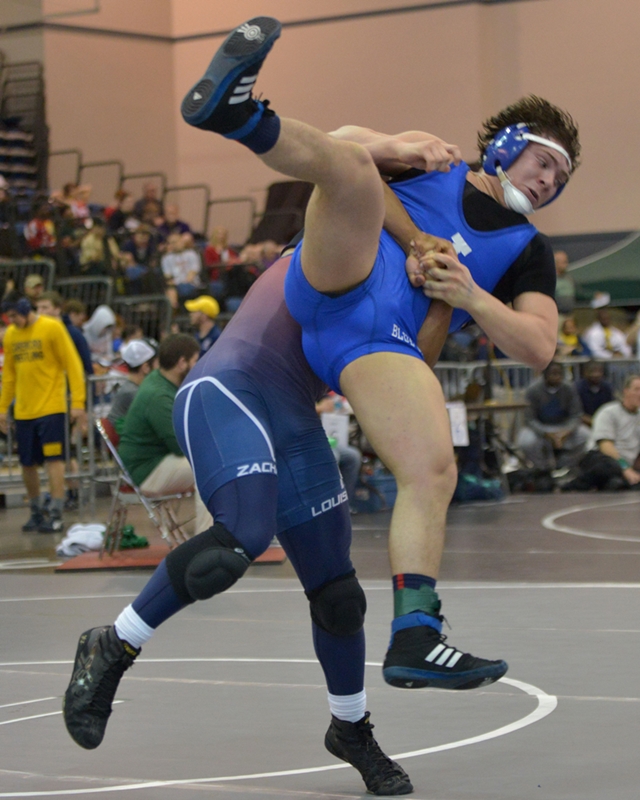 After receiving a penalty point from Olano in the first 40 seconds of their finals match, Sylve went on a scoring tear. With not even 30 seconds having elapsed in the second period he had put Deshotel on his back twice with a nearside cradle and forged an 8-0 lead. He put the Basile senior on his back once again to take a 10-0 lead into the third period. In the third Olano managed a reversal, but Sylve tacked on four additional points to prevail with a major 14-2 decision and give De la Salle their second individual state championship in a row.