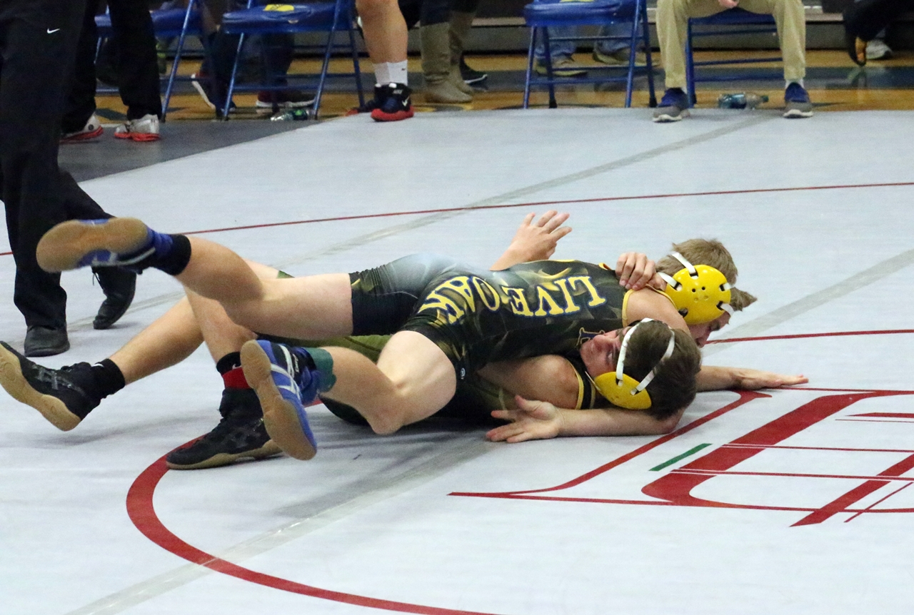 defeated Live Oak's Mason Middleton via an 18-2 technical fall (top).