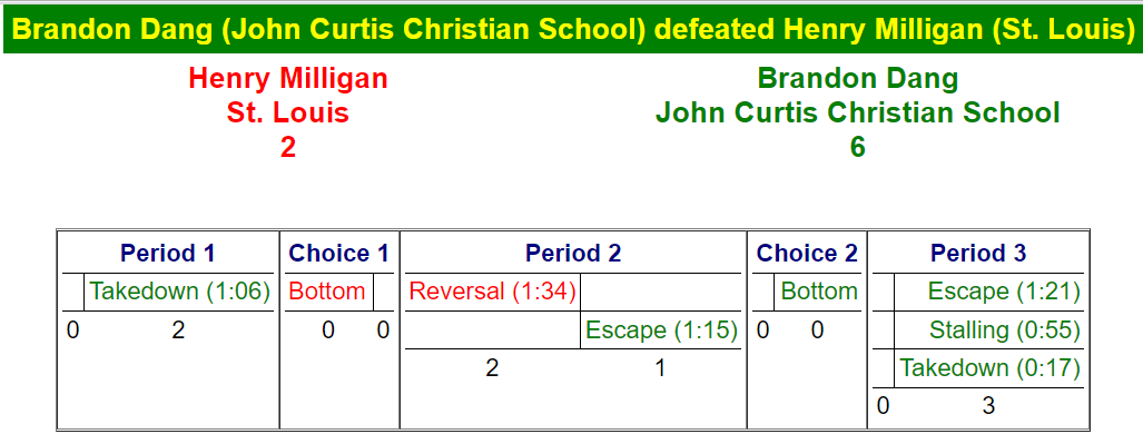 | (1) Henry Milligan (StL) pinned (8) Tristan Williford (BRU) in 0:20 |