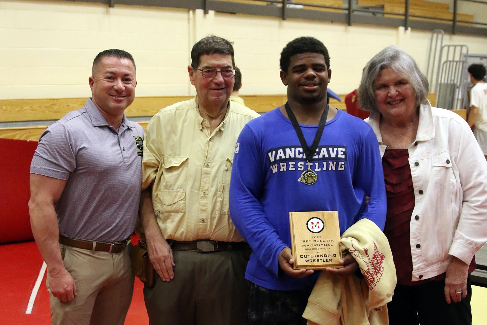 To nobodies surprise, Brother Martin won the 2025 Trey Culotta Invitational, held at Brother Martin on December 19th and 20th. This was the fifth year in a row in which the Crusaders came out on top. Brother Martin scored 275 points. Perhaps unexpectedly (well, to me at least, having been away for a couple of years), St. Thomas More of Lafayette placed second with 256 points. Vestavia Hills, AL was right behind the Cougars with 254 points. Holy Cross was fourth with 251 points, followed by Teurlings Catholic with 247.5 points.