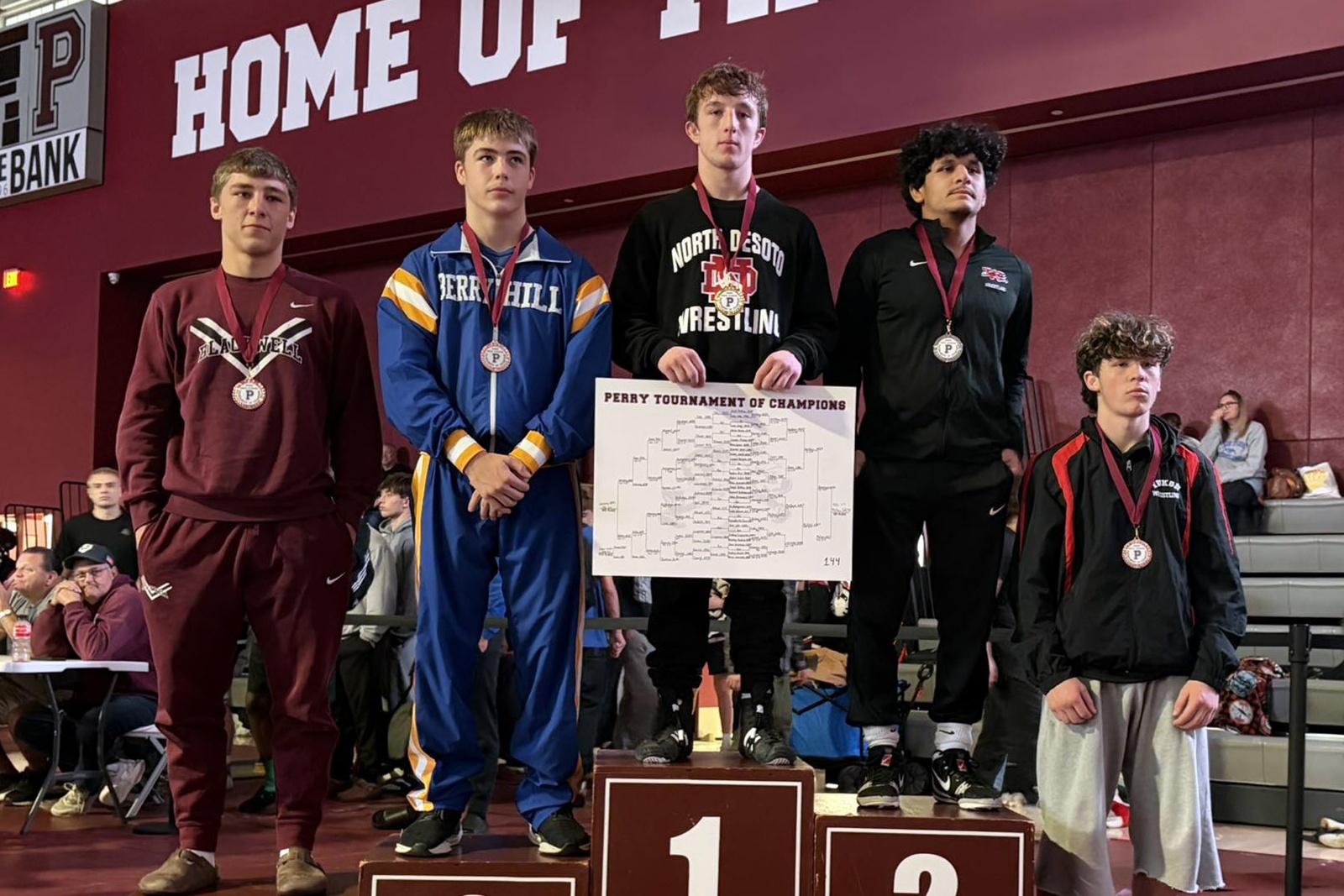 Two North Desoto Griffins placed in the top-six at the Perry Tournament of Champions, held on December 12th and 13th in Perry, Oklahoma. Kade Tinsley placed sixth at 215 lbs. while teammate Jacob Kershaw won the event. Kershaw bested 23 others in the 144 lbs. weight class, with two falls and two technical falls before a 7-1 finals performance. Kershaw, a three-time state runner-up in Division II and a two-time Louisiana Classic runner-up is 19-0 after last weekend. Kershaw's record has nine technical falls, six pins, one major decision. His other three wins were by decisions of 7-4, 7-3 and 7-1, all against out-of-state competition. |