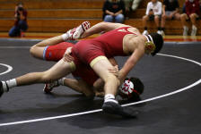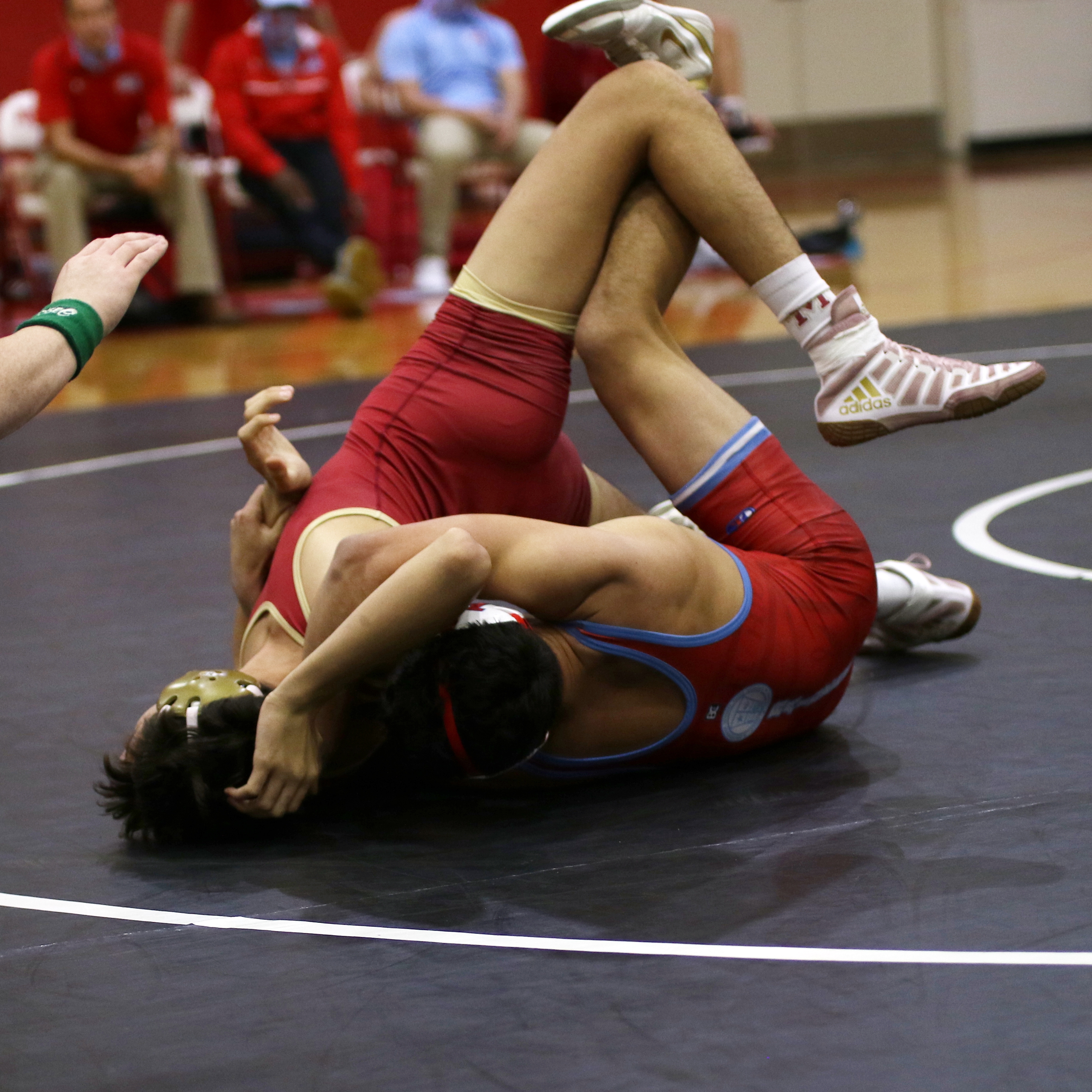 Raiders' only fall of the evening. Two matches later senior Jacob Ramirez